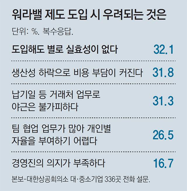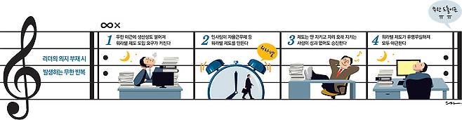 자율근무제를 도입한 기업 관계자는 “어제 12시간 일하고 오늘은 3시간만 일하기로 했어도 다들 눈치를 보며 또 오래 앉아 있다. 이들에게 최고경영진의 의지가 확실하며 중간관리자도 이를 인식하고 있다는 확신을 줘야 문화로 정착시킬 수 있다”고 말했다.
