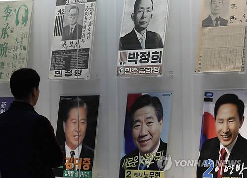 (세종=연합뉴스) 이진욱 기자 = 110억원대 뇌물 수수와 340억원대 비자금 조성 등 혐의를 받는 이명박 전 대통령의 구속 여부를 놓고 서류심사중인 22일 오후 세종시 대통령기록관에서 관람객들이 역대 대통령 선거 포스터를 보고 있다. 2018.3.22