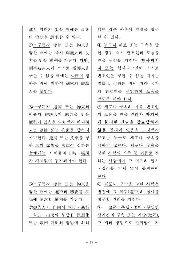 ⑤ 체포나 구속의 이유, 변호인의 도움을 받을 권리와 자기에게 불리한 진술을 강요당하지 않을 권리가 있음을 고지받지 않고는 누구도 체포나 구속을 당하지 않는다. 체포나 구속을 당한 사람의 가족 등 법률로 정하는 사람에게 그 이유와 일시ㆍ장소를 지체 없이 통지해야 한다.