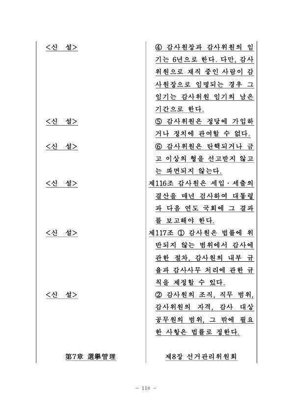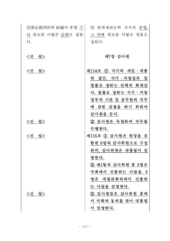 제115조 ① 감사원은 원장을 포함한 9명의 감사위원으로 구성하며, 감사위원은 대통령이 임명한다.