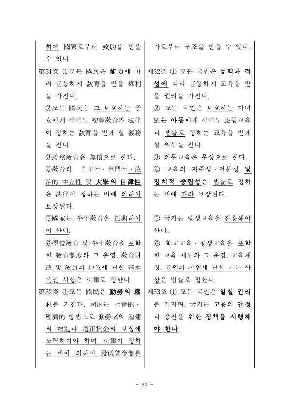 제33조 ① 모든 국민은 일할 권리를 가지며, 국가는 고용의 안정과 증진을 위한 정책을 시행해야 한다.