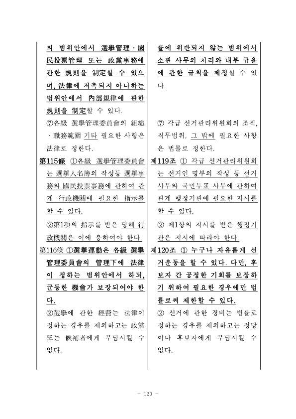 제120조 ① 누구나 자유롭게 선거운동을 할 수 있다. 다만, 후보자 간 공정한 기회를 보장하기 위하여 필요한 경우에만 법률로써 제한할 수 있다.
