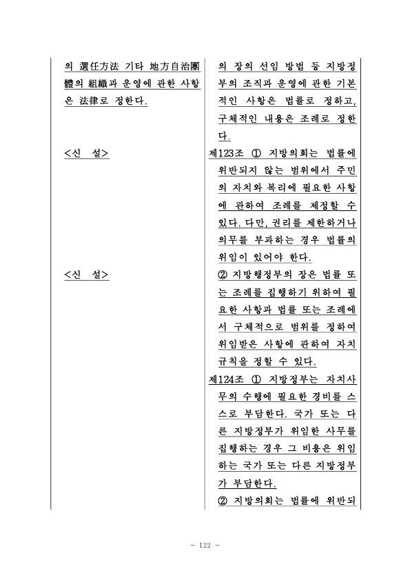 제122조 ① 지방정부에 주민이 보통ㆍ평등ㆍ직접ㆍ비밀 선거로 구성하는 지방의회를 둔다.