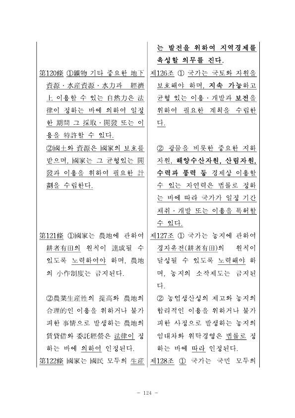 제126조 ① 국가는 국토와 자원을 보호해야 하며, 지속 가능하고 균형 있는 이용ㆍ개발과 보전을 위하여 필요한 계획을 수립한다.