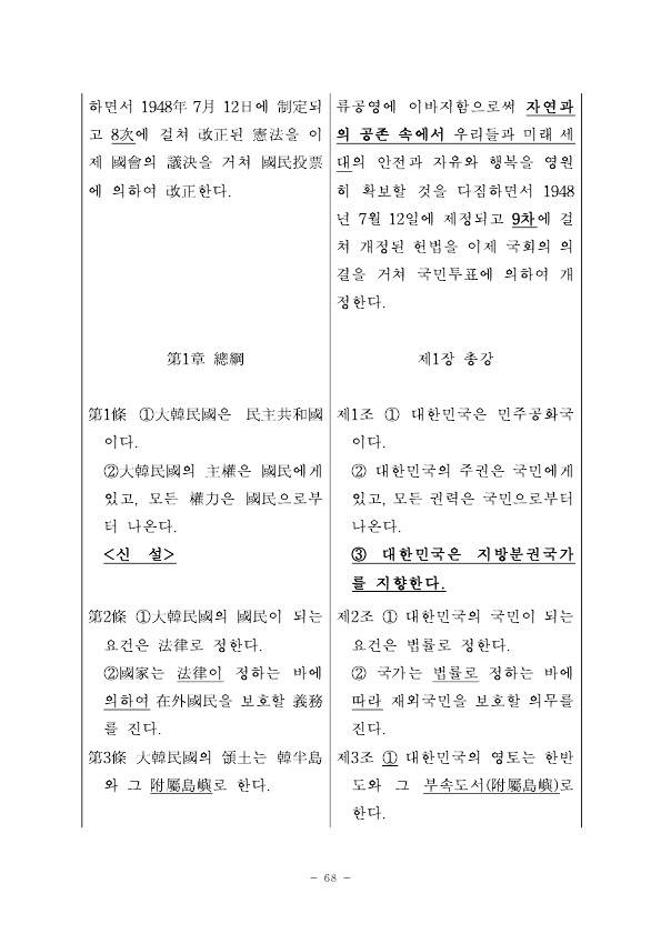 유구한 역사와 전통에 빛나는 우리 대한국민은 3ㆍ1운동으로 건립된 대한민국임시정부의 법통과 불의에 항거한 4ㆍ19혁명, 부마민주항쟁과 5ㆍ18민주화운동, 6ㆍ10항쟁의 민주이념을 계승하고, 조국의 민주개혁과 평화 통일의 사명을 바탕으로 정의ㆍ인도와 동포애로써 민족의 단결을 공고히 하고, 모든 사회적 폐습과 불의를 타파하며, 자치와 분권을 강화하고, 자율과 조화를 바탕으로 자유민주적 기본질서를 더욱 확고히 하여 정치ㆍ경제ㆍ사회ㆍ문화의 모든 영역에서 개개인의 기회를 균등히 하고, 능력을 최고도로 발휘하게 하며, 자유와 권리에 따르는 책임과 의무를 완수하게 하여, 안으로는 국민생활의 균등한 향상과 지역 간 균형발전을 도모하고 밖으로는 항구적인 세계평화와 인류공영에 이바지함으로써 자연과의 공존 속에서 우리들과 미래 세대의 안전과 자유와 행복을 영원히 확보할 것을 다짐하면서 1948년 7월 12일에 제정되고 9차에 걸쳐 개정된 헌법을 이제 국회의 의결을 거쳐 국민투표에 의하여 개정한다.