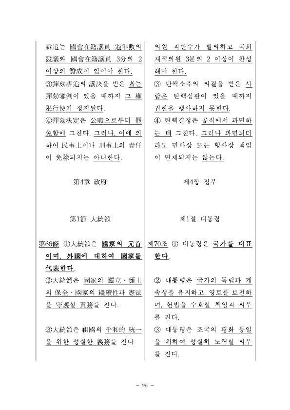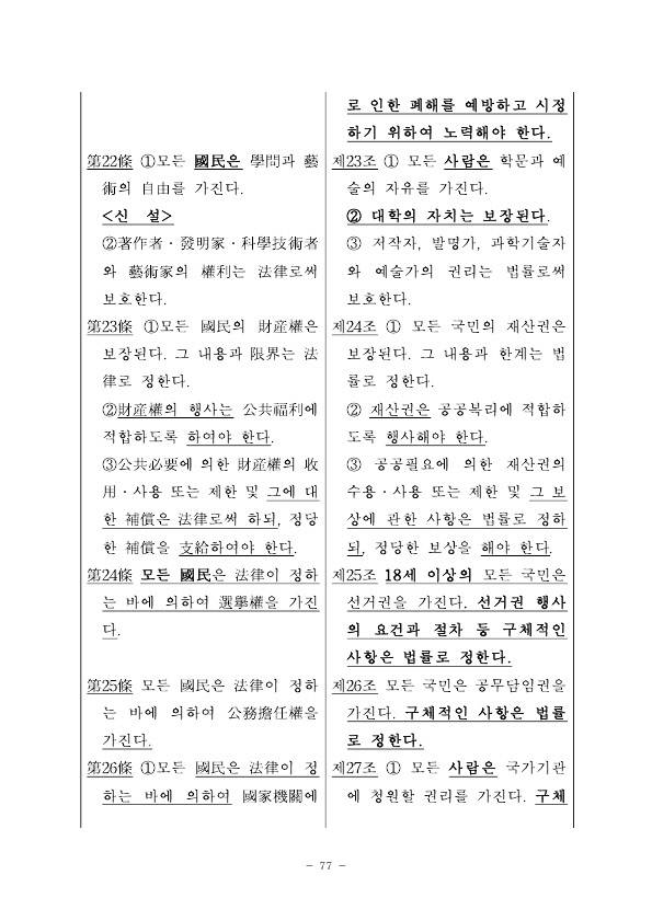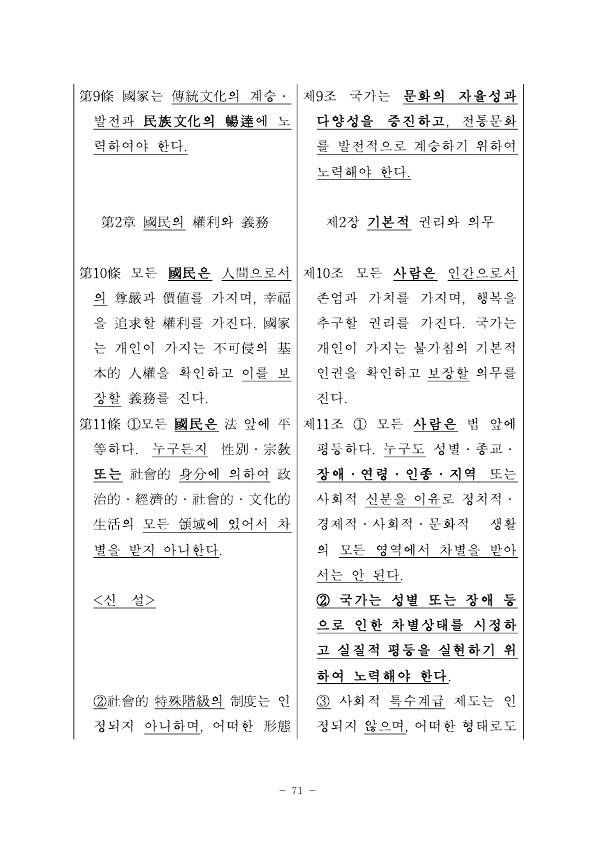 청와대가 22일 공개한 대통령 개헌안의 특징은 그동안 한자로 표기됐던 헌법을 한글화했다는 것이다. 한글화 작업과 함께 맞춤법 오류, 모호한 표현 등의 오류도 바로잡았다.