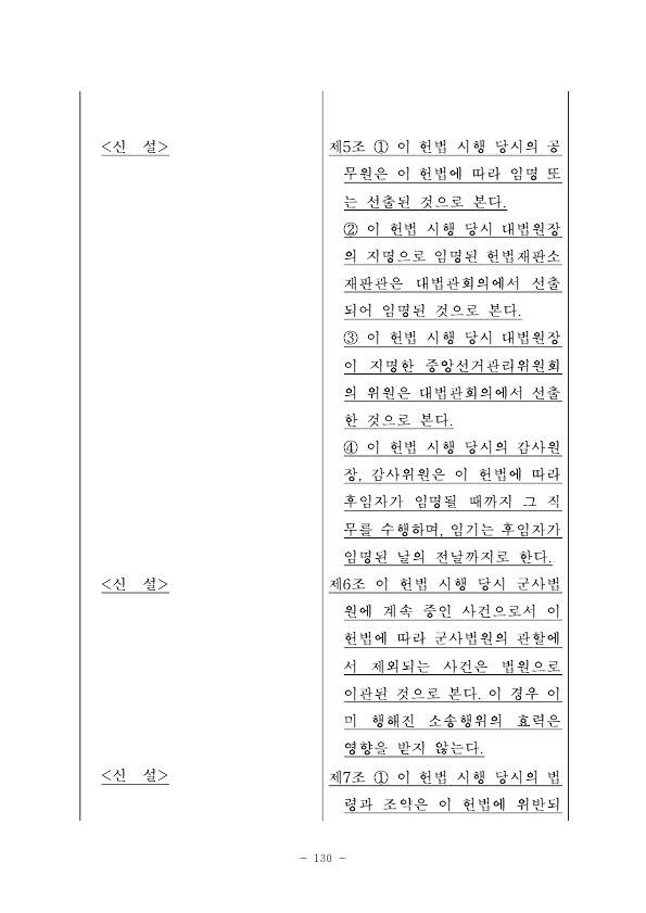 제5조 ① 이 헌법 시행 당시의 공무원은 이 헌법에 따라 임명 또는 선출된 것으로 본다.