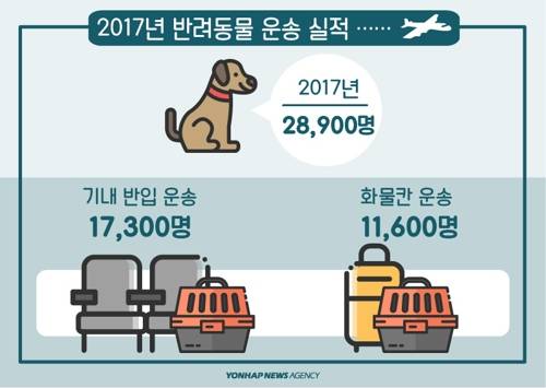 반려인구 1천만 명 시대에 반려동물과 함께 비행기를 타는 사람들이 늘고 있다. 대한항공에 따르면, 반려동물과 국내외로 이동한 승객은 2014년 1만6천 명, 2015년 2만500명, 2016년 2만5천 명, 지난해 2만8천900명으로 매년 증가하고 있다. 지난해 대한항공과 아시아나항공을 타고 국내외로 이동한 반려동물은 총 4만7천701마리에 달했다. 4년 새 2배 가까이로 늘었다.