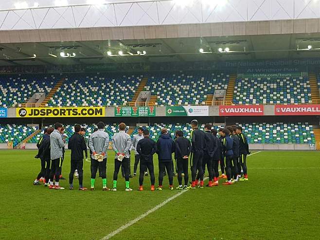 북아일랜드와 경기 전날인 금요일 오후 2시(현지시간) 소나기가 내리는 상황에도 우리 선수들은 마지막 담금질을 하고 있었어요. 훈련 전에는 가볍게 볼돌리기를 하며 밝게 웃다가도 훈련이 시작되면 눈빛이 달라지는 선수들을 보면서 각오가 느껴졌습니다.