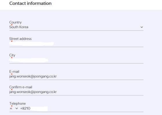 다음 단계로 넘어가서 주소를 입력합니다. 네이버의 주소 영문 변환기를 이용하면 편리합니다. 이메일과 전화번호도 입력하는데 010에서 앞자리 0을 빼는 건 센스. 맨 아래 ‘수령장소(Pick-up location)’를 묻는 말엔 서울(Seoul)을 고르면 됩니다.
