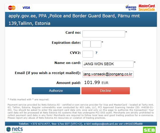 에스토니아 이레지던시의 공식 발급 수수료는 100유로. 카드 수수료를 포함해 101.99유로를 결제하라네요. 카드 번호와 유효기간, 이름 등을 입력합니다. 아래와 같은 화면이 뜨면 모든 절차가 완료됐다는 의미입니다. 시작부터 끝까지 저 같은 까막눈도 30분이면 충분합니다.