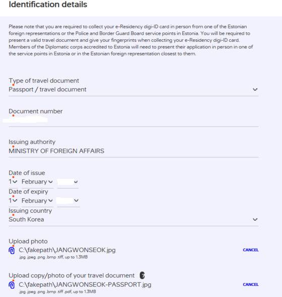 그다음은 여권정보를 입력할 차례입니다. 여권번호와 발행기관, 유효기간을 순서대로 입력하는데 발행기관은 외교부 영문명(Minister of Foreign Affairs)을 쓰면 됩니다. 그런 다음, 여권 사본 파일과 증명사진 파일을 첨부합니다. 단 이때 파일의 크기가 1.3MB 이내여야 한다네요.