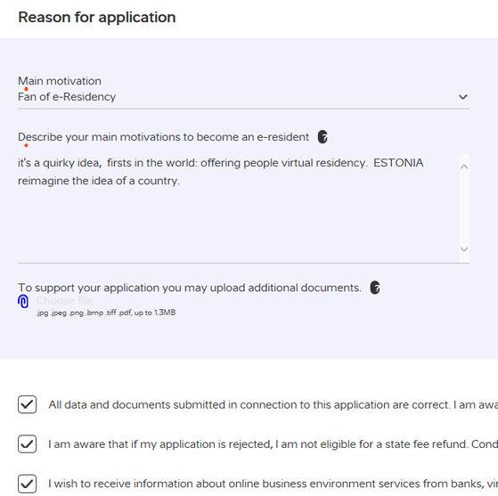 이레지던시를 발급하는 이유를 묻는 말엔 ‘Fan of e-Residency’를 골랐습니다. 문법이 엉망이지만 구체적인 이유도 영어로 간단히 기재합니다. 정보의 정확성, 최종 의사 등을 묻는 말에 체크하면 결제창으로 넘어갑니다.