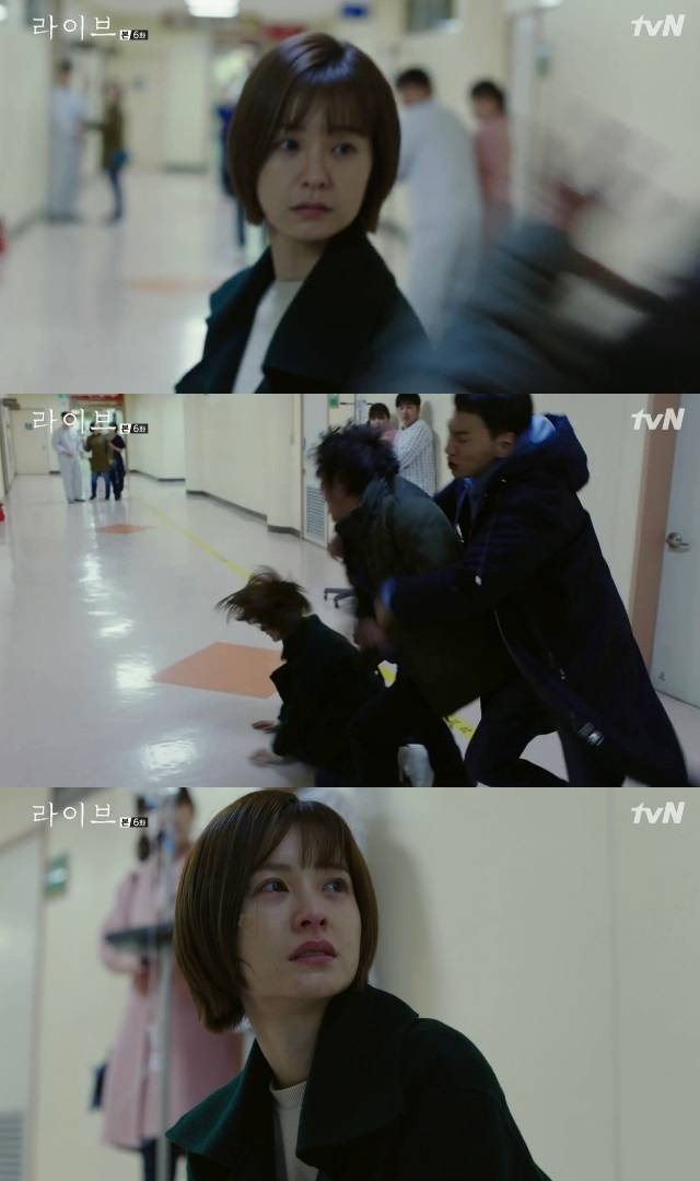 3월 25일 방송된 tvN 주말드라마 '라이브' 6회 (극본 노희경/연출 김규태)에서 하정오(정유미 분)는 임산부에게 테이저건을 쏜 일을 자책했다.