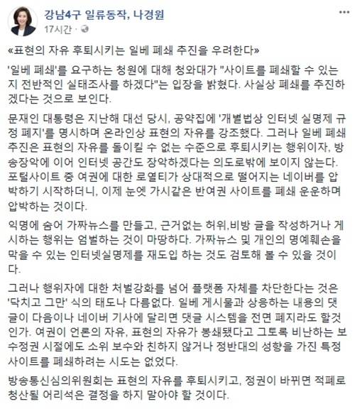 해당 글에서 나경원 의원은 "'일베 폐쇄'를 요구하는 청원에 대해 청와대가 '사이트를 폐쇄할 수 있는지 전반적인 실태조사를 하겠다'는 입장을 밝혔다"며 "사실상 폐쇄를 추진하겠다는 것으로 보인다"고 적었다.