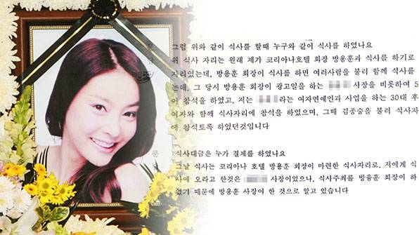 2007년 10월의 어느 날, 데뷔를 앞둔 신인 탤런트 장자연은 소속사 김종승 대표와 서울 강남구 청담동의 한 고급 중식당에서 열린 모임에 참석했다. 한 참석자에 따르면 이 모임에는 이들을 포함해 코리아나호텔 방용훈 사장과 스포츠조선 A 사장, 미국 외교계와 언론계 고위 인사 등 8명이 참석했다. 이 모임을 주재했고 식비까지 결제한 사람은 방용훈 사장이었다고 알려졌다.