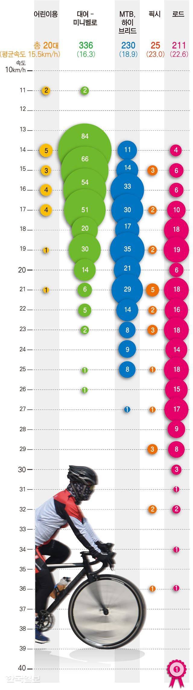 한국일보 ‘View&(뷰엔)’팀은 이날오후1시부터2시간 반 동안 이곳을 지나는 자전거822대의 속도를 측정했다. 그 결과 최저0㎞/h(제 자리에 멈춰 있는 경우)부터 최고40㎞/h까지 다양한 분포를 보였다. 혼란은 제각기 다른 속도를 지닌 사람들이 다양한 방식으로 동일한 장소를 지날 수밖에 없는 상황에서 야기된 필연이었다.