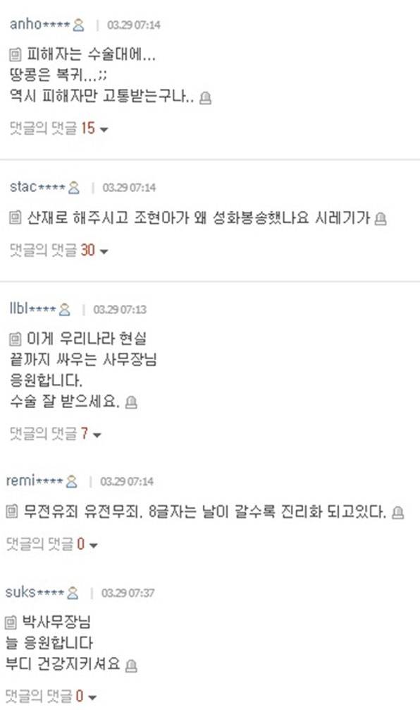 피해자와 가해자의 상반된 근황을 본 누리꾼들은 "역시 피해자만 고통받는구나", "이게 우리나라 현실", "'무전유죄 유전무죄'는 날이 갈수록 진리화 되고 있다", "박 사무장님 늘 응원합니다. 부디 건강 지키시라"는 반응을 보였다.