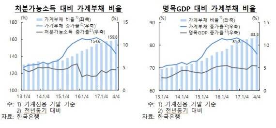 처분가능소득 대비 가계부채 비율은 2016년말 154.6%에서 2017년말 159.8%로 5.2%p 높아졌다. 명목GDP 대비 가계부채 비율도 2016년말 81.8%에서 2017년말 83.8%로 2.0%p 상승했다.