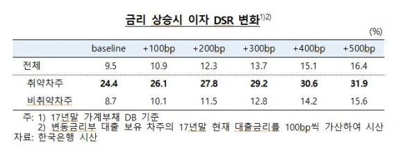 한은은 "이자 상환부담이 상대적으로 큰 高DSR 차주의 비중 변화를 보면 가계대출 차주 전체 기준으로 대출금리 100bp 상승시 4.2%(2017년말)에서 5.0%로 올라간다"고 설명했다.