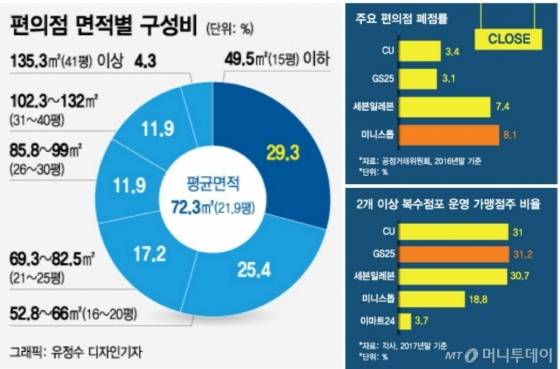 ◇치열한 경쟁, 매출 내리막인데…지금 창업해도 되나=30일 관련 업계에 따르면 국내 5대 편의점 프랜차이즈 점포수는 지난해말 현재 3만9277개로 전년 대비 14.7% 증가했다. 브랜드별 매장수는 △CU 1만2503개 △GS25 1만2429개 △세븐일레븐 9231개 △이마트24 2652개 △미니스톱 2462개 등이다. 365플러스·씨스페이스·스토리웨이 등 군소 브랜드까지 합하면 4만개를 훌쩍 넘어선다.