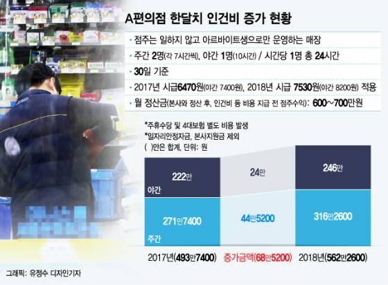 30일 편의점업계에 따르면 최저임금이 지난해 6470원에서 7530원으로 오른 뒤 최소인원(상시 1명 근무)에 24시간 아르바이트생으로 운영되는 가게의 경우 한달 순수 급여 증가분만 67만원에 달하는 것으로 집계됐다.