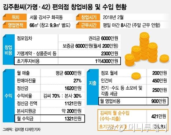 판매마진율 30%, 본사 납입금 30% 조건을 적용한 정산금 잔액에 본사의 각종 지원금(월 150만~200만원)을 합산하고, 월세(서울 300만원·지방 150만원), 인건비 450만원(최저임금, 주휴·야간수당 포함 기준), 각종 소모비용 250만원 등 지출을 뺀 사업자의 순수입은 전국 월 평균 330만원, 서울 370만원이 된다. 편의점 점포 1개를 운영해 연 4000만~4500만원을 버는 것이다.