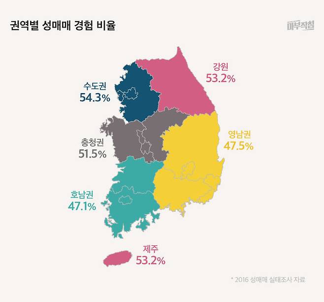 전국을 수도권, 충청권, 영남권, 호남권, 제주 강원 등 5대 권역으로 나눴을 때 수도권이 54.3%로 가장 높았고, 영남권(47.5%)과 호남권(47.1%)이 상대적으로 낮은 수치였다. 성구매 경험자 대부분은 20~24세에 최초 성구매를 한 것으로 조사됐다. 세부적으로, 최초 성구매 연령은 20~24세에 53.8%로 집중돼 있다. 다음이 25~29세에 27.6%로, 연령이 높아질수록 비중은 낮아진다. 20세 미만도 3.9%로 분석됐다.