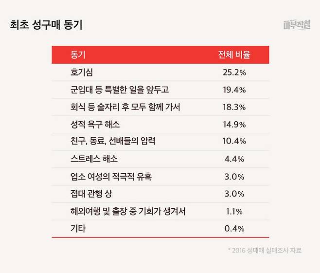 '최초 성구매 동기'는 다양했지만, 가장 많은 응답은 '호기심'(25.2%)이었다. 다음이 '군입대 등 특별한 일을 앞두고'(19.4%), '회식 등 술자리 후 모두 함께 가서'(18.3%), '성적 욕구 해소'(14.9%), '친구 동료 선배의 압력'(10.4%) 순으로 나타났다. 동기 부분에선 연령대별 특징이 존재했다. 40대는 '접대 관행'을 가장 높은 동기로 삼았고, 20세 미만에선 '호기심'이 가장 높은 비율을 차지했다.