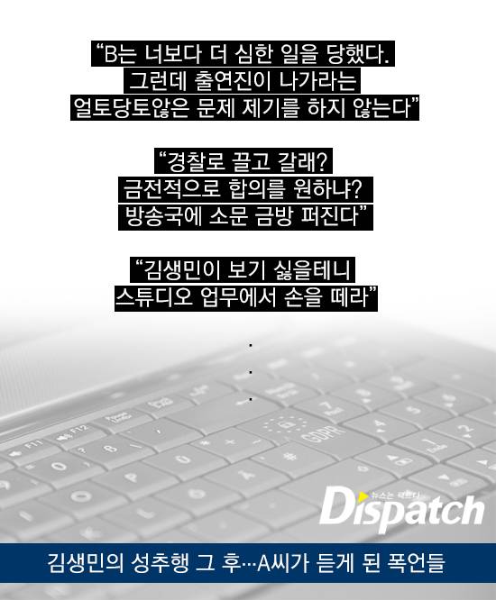 김생민 측은 '디스패치'에 "담당 PD한테서 B씨 사건만 전해 듣고 직접 사과했다"고 말했다. A씨 건을 묻자, 머뭇거렸다. 그리고 다음 날, 다시 전화가 왔다.