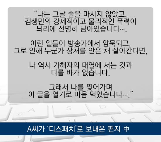 "(중략) 이런 일들이 방송가에서 암묵되고, 그로 인해 누군가 상처를 안은 채 살아간다면, 나 역시 가해자의 대열에 서는 것과 다를 바가 없습니다. 그래서 나를 찢어가며 이 글을 열기로 마음 먹었습니다." (편지 내용 中)