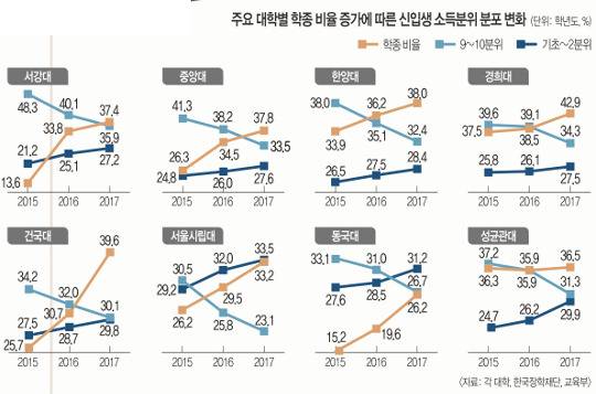 학종 비율을 늘린 대학들은 어떨까. 서강대는 학종 비율을 2015학년도에 13.6%에서 2017학년도 37.4%로 3배가량 끌어올렸다. 저소득층(기초∼2분위 이하) 신입생이 같은 기간 21.2%에서 27.2%로 늘었다. 반면 고소득층(9∼10분위)은 같은 기간 48.3%에서 35.9%로 줄었다. 신입생들의 소득 격차가 감소한 것이다. 학종 비율을 늘린 중앙대 한양대 경희대 등도 비슷한 양상을 나타냈다.