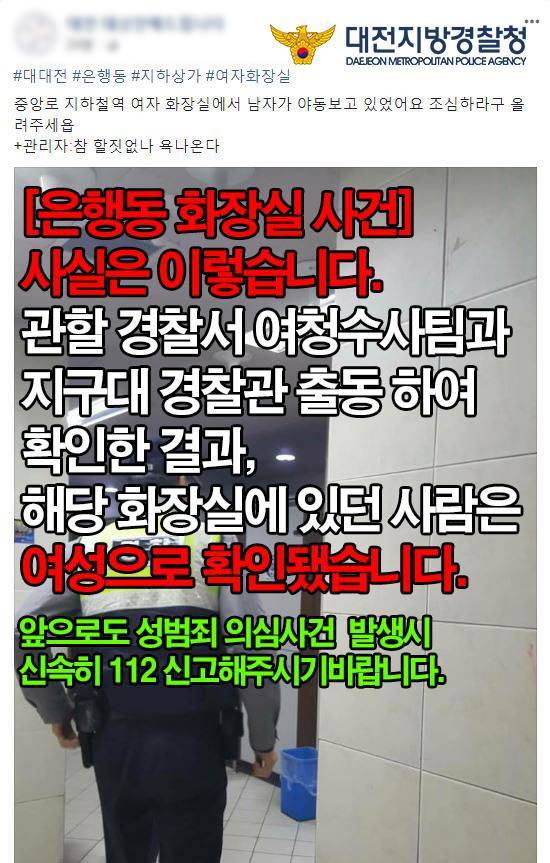 대전경찰청은 이날 페이스북에 “‘은행동 화장실 사건’ 사실은 이렇습니다”라는 글을 올렸다.