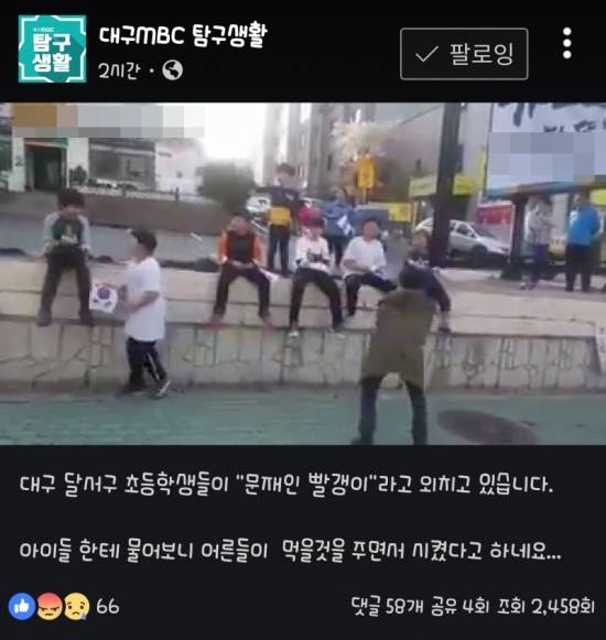 대구 MBC는 4일 SNS 계정 ‘대구 MBC 탐구 생활’을 통해 달서구 초등학생들이 “문재인 빨갱이”라고 외치고 있는 장면을 공개했다. 24초짜리 영상을 보면 초등학생 8명이 거리에서 태극기를 흔들며 문 대통령에 대해 “문재인 빨갱이”라고 소리치고 있고, 어른들이 이 장면을 지켜보고 있다.