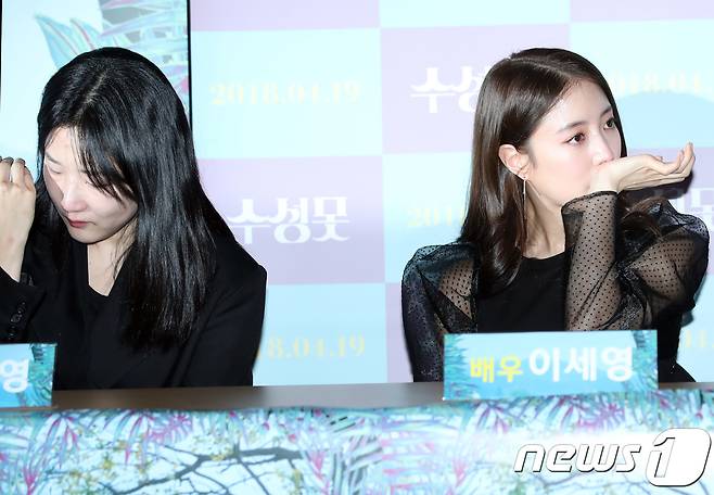 (서울=뉴스1) 권현진 기자 = 유지영 감독과 배우 이세영(오른쪽)이 4일 오후 서울 롯데 건대시네마에서 열린 영화 ‘수성못’ 언론시사회에 참석해 눈물을 흘리고 있다.