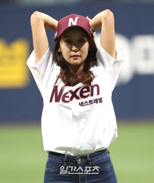 '2018 프로야구 신한은행 마이카 KBO리그' 넥센 히어로즈와 kt 위즈 경기가 5일 오후 고척스카이돔에서 펼쳐졌다. 박지영 MBC스포츠플러스 아나운서가 시구하고있다. 고척=정시종 기자 jung.sichong@jtbc.co.kr /2018.04.05.