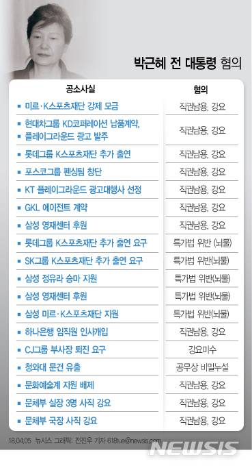박 전 대통령은 삼성에 정유라(22)씨 승마지원과 한국동계스포츠영재센터 후원을 강요하고, 롯데·SK에 K스포츠 재단 추가 출연을 요구한 혐의 등도 받고 있다.