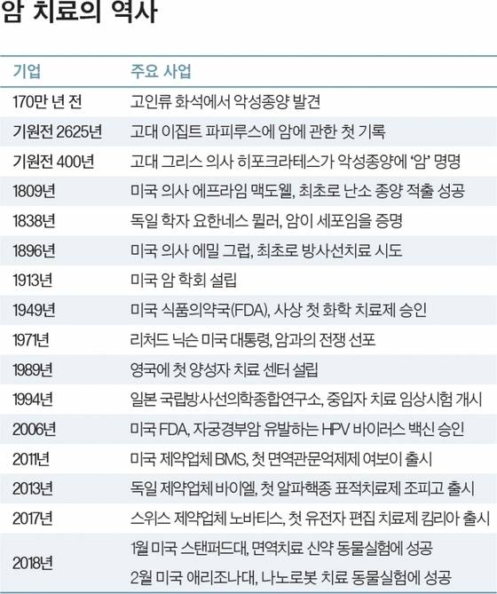 질기게도 인류를 괴롭혀온 암에 우리는 속수무책이었다. 다양한 원인으로 전신에 갖가지 형태로 나타나는 암은 실체를 파악하는 것조차 쉽지 않은 존재였기 때문이다. 악성종양에 처음 이름을 붙인 것은 기원전 400년께 활동한 고대 그리스 의사 히포크라테스지만 그 정체가 세포라는 사실이 밝혀진 것은 지금으로부터 불과 200년도 채 지나지 않은 1838년의 일이다. 방사선치료, 화학치료 등 기본적인 항암 치료도 20세기에 들어서야 겨우 대중화됐다.