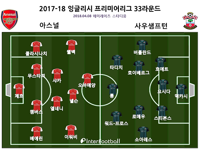아스널은 8일 오후 10시 15분(한국시간) 영국 런던에 위치한 에미레이츠 스타디움에서 열린 사우샘프턴과의 2017-18 잉글리시 프리미어리그(EPL) 33라운드 홈경기에서 3-2로 승리했다. 이로써 아스널은 리그에서 3연승을 이어가며, 로테이션과 승점 3점이란 두 마리 토끼를 모두 잡았다.