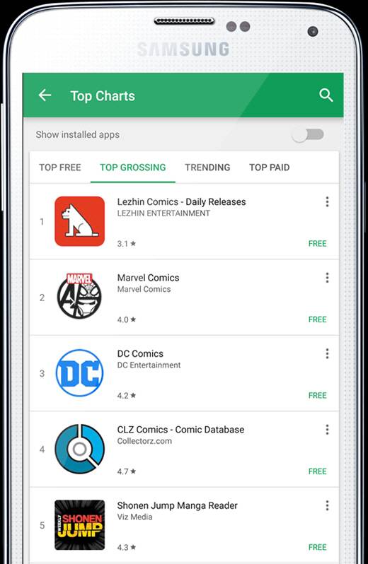 한국웹툰 수출로 미국 시장에서 마블과 DC는 물론 일본 최고의 만화잡지인 소년점프를 제치고 구글 플레이 만화 카테고리 최고매출 1위를 차지한 것은 레진코믹스가 처음이다.
