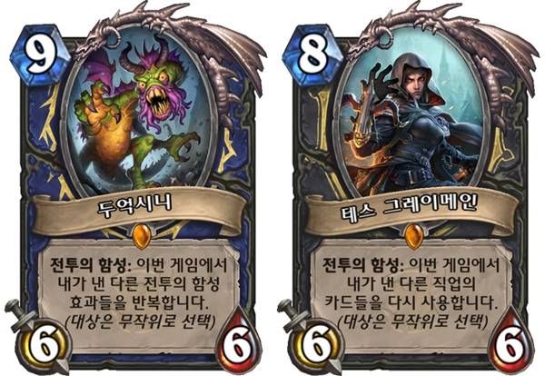 반면 스티븐 창 부 디자이너는 재미있는 카드로 '테스 그레이메인'을 지목했다. 이 카드는 도적 전용 전설 하수인으로, 이번 게임에서 자신이 낸 다른 직업의 카드들을 한꺼번에 다시 사용한다. 다른 직업 카드를 훔칠 수 있는 도적의 특성을 십분 활용한 카드다. 스티븐 창은 "테스 그레이메인이 덱에 있으면 다른 직업 카드를 손에 넣었을 때 고민할 것이 많아진다"며 "당장 쓰는 것도 중요하지만, 나중에 (테스 그레이메인을 냈을 때) 어떻게 발동될지 생각해놓는 것도 중요하다"고 말했다.