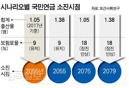 12일 한국보건사회연구원의 계간지 ‘보건사회연구’에 실린 ‘인구ㆍ성장ㆍ이자ㆍ소득의 상대적 관계가 국민연금 기금에 미치는 영향에 대한 고찰’ 논문에 따르면 역대 최저였던 지난해의 합계출산율(1.05명)이 계속 유지되고 국민연금 보험료율을 현행 9%로 유지하는 경우 국민연금 기금이 2055년 고갈되는 것으로 추계됐다. 2013년 제3차 국민연금 장기재정추계 당시 정부가 전망한 고갈 시점인 2060년보다 5년 앞당겨지는 것이다.