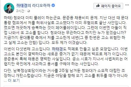 하 위원은 13일 자신의 페이스북을 통해 “문준용 채용비리 문제는 지난 대선 때 문 대통령 측에서 저를 허위사실로 고소했다가 이미 무혐의로 끝난 사안이다”라며 “졌으면 깨끗하게 승복하는 것이 페어플레이다”라고 밝혔다. 이어 “그런데 이번엔 아들이 직접 나와서 또 고소를 한다”며 “청와대는 무관하다고 하지만 누가 믿느냐”고 의혹을 제기했다.