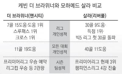 최근 분위기는 완전히 바뀌었다. BBC가 자사 해설위원 17명을 대상으로 올해의 선수 가상투표를 실시한 결과 9-8로 살라가 더 브라위너에게 앞섰다. 살라는 15일 본머스전에서 리그 30호골을 성공시켰다. 아프리카 선수로 30골 클럽에 가입한 것은 첼시의 전설 디디에 드로그바도 해내지 못한 위업이다. 38경기 체제 프리미어리그 한 시즌 최다골 기록(31골)에도 한 골 차로 다가섰다. 살라는 또 챔피언스리그 9골(예선 포함), FA컵 1골을 보태 리버풀 선수로는 1987년 이안 러시 이후 31년 만에 40골을 돌파했다. 살라는 리버풀이 올 시즌 기록한 78골의 절반(30골9도움)에 관여했는데 이 또한 리그 최고다. 특히 살라가 맨시티와의 챔피언스리그 8강전에서 2골을 터뜨리며 리버풀을 4강에 올려놓은 게 분수령이 됐다.