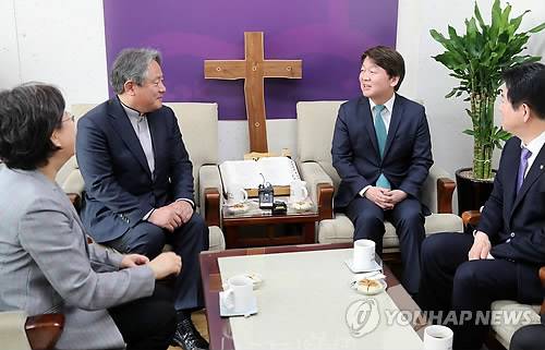 (서울=연합뉴스) 윤동진 기자 = 바른미래당 안철수 서울시장 예비후보가 17일 오전 서울 종로구 한국기독교회관에서 한국기독교교회협의회 이홍정 목사와 대화하고 있다. 2018.4.17