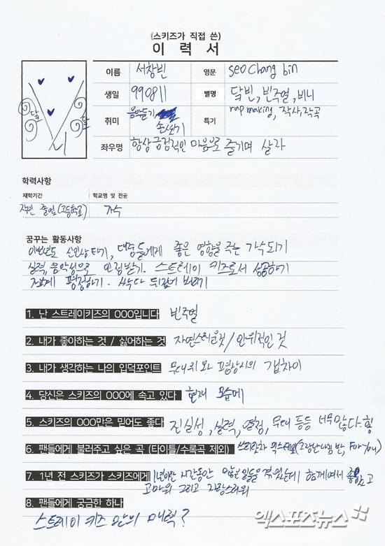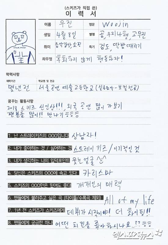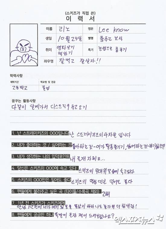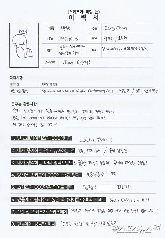 데뷔 전부터 엠넷 '스트레이키즈'를 통해 실력을 입증하고 하루가 다르게 성장하고 있는 JYP 엔터테인먼트의 새로운 아이돌 스트레이키즈를 추천합니다. 스트레이키즈에 대해 더 알고 싶은 여러분들을 위해 멤버들이 직접 이력서를 작성했어요. 초록창 포털사이트(N사) 인물정보에 나열된 순서대로 스트레이키즈 멤버들을 소개합니다.