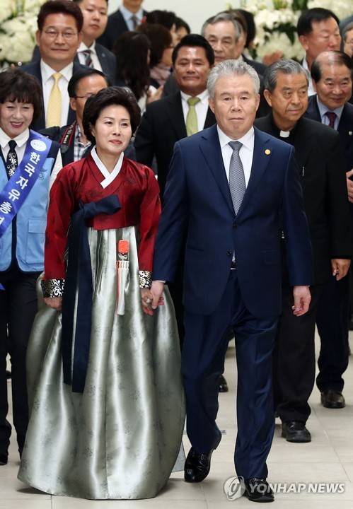 (서울=연합뉴스) 이재희 기자 = 박종환 자유총연맹 신임 총재가 19일 오후 서울 중구 남산자유센터에서 열린 제17대 총재 취임식장에 부인 강영숙 씨의 손을 잡고 입장하고 있다. 2018.4.19