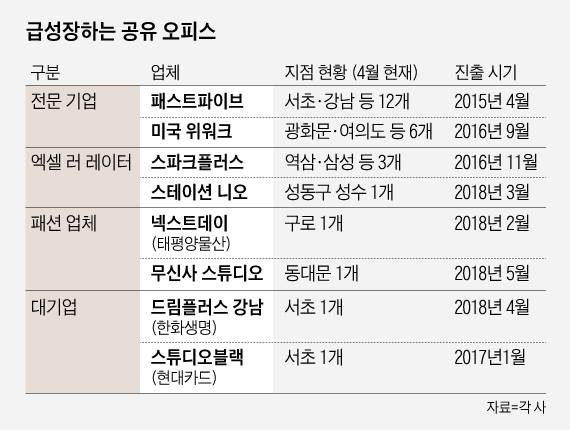 2015년부터 서울 시내에 등장한 공유 오피스 시장이 올 들어 급성장하고 있다. 국내 스타트업 패스트파이브, 미국 위워크 등 선발 업체들이 지점 수를 크게 늘리는 가운데 한화생명·현대카드 등 대기업과 액셀러레이터(창업 지원 기업), 중견 패션업체 등 다양한 분야 기업이 이 시장에 새롭게 뛰어들고 있다. 지점 규모도 커지고 지역도 점차 부도심으로 확산하고 있다.