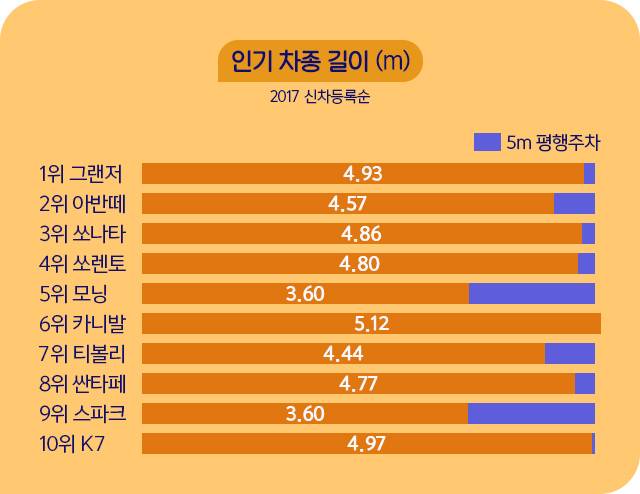평행주차 구역의 길이는 그대로인데 차는 계속 커지고 있다. 2017년 한 해 동안 인기를 끌었던 제품들의 길이를 살펴봤다. (신형 모델 기준)