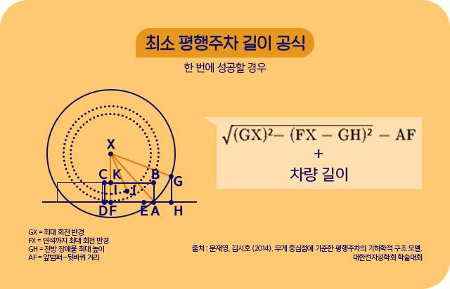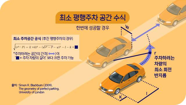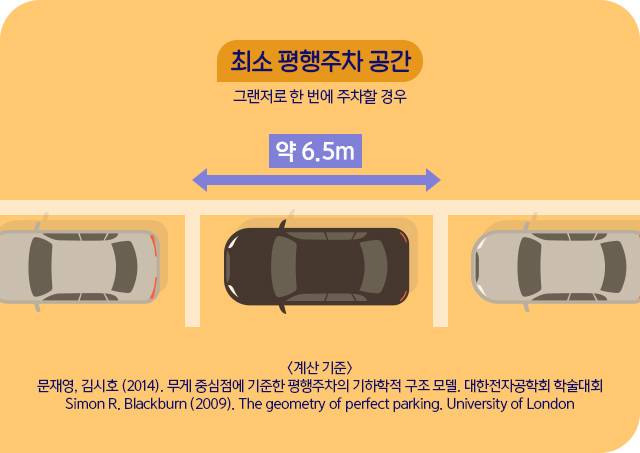 평행주차를 쉽게 하려면 주차공간이 얼마나 필요할까? 찾아보니 우리와 비슷한 고민을 해온 연구자들 여럿 있었다. 2009년 영국에서는 주차공간의 길이를 구하는 공식이 발표됐다. 자동차의 바퀴 간격, 회전 반지름, 앞 차량의 너비 등을 대입해 평행주차를 위한 최소 간격을 산출하는 방법이다.